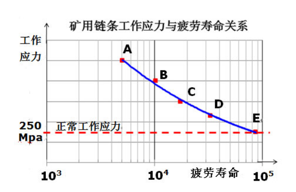 疲勞斷裂失效是礦用鏈條常見的一種失效形式,煤礦井下輸送機工作時,鏈條處于運動狀態(tài),承受的是動載載荷,屬于動態(tài)疲勞范疇,因此鏈條的使用壽命(疲勞壽命)與其工作時所受的載荷(應(yīng)力)大小有直接關(guān)系,即礦用鏈條工作時所受的工作應(yīng)力越高,其疲勞壽命越短,反之疲勞壽命則越長。通過大量系統(tǒng)的實驗數(shù)據(jù)繪制的礦用鏈條工作應(yīng)力與疲勞壽命關(guān)系曲線如下圖所示。