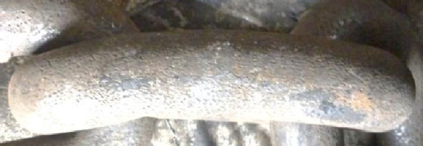 因刮卡、卡阻、撞擊導(dǎo)致鏈條斷裂的主要特征是:斷環(huán)多為刮板下平環(huán)的頂部,且多為鏈環(huán)前進方向反向的頂部斷裂,如圖例所示。