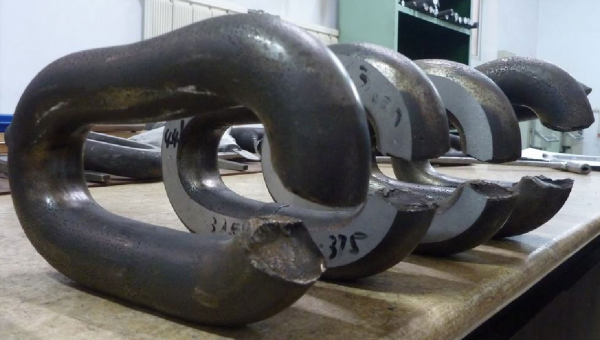 對評估合格后的鏈條進行目視檢查,切除帶有嚴重損傷的鏈環(huán)。目視檢查后再進行無損探傷(磁粉探傷或著色探傷)檢測裂紋,切除帶有裂紋的鏈環(huán),用接鏈環(huán)替換切除的鏈環(huán),或返回制造廠修配。
