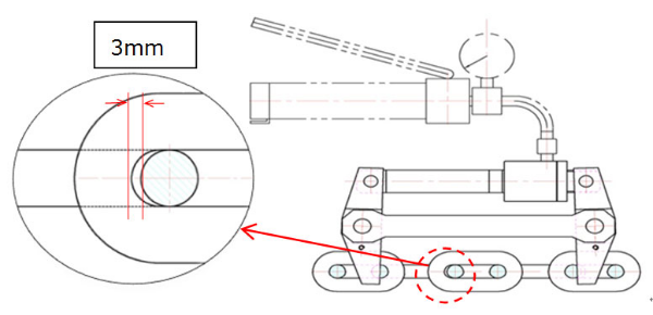 a.將預(yù)緊力測試儀放在三個鏈環(huán)上,操作手動泵,直到鏈環(huán)間空隙達到3毫米,如下圖所示。