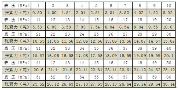 b. 此時從壓力表讀出壓力值,查閱下面的壓力值與噸位對照表即可得到鏈條預(yù)緊力噸位: